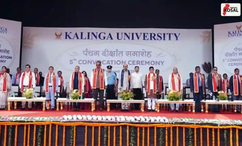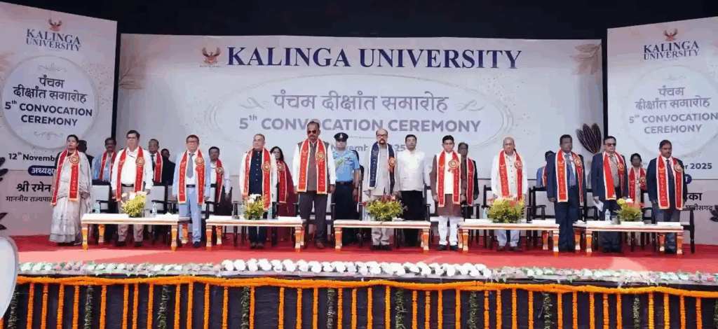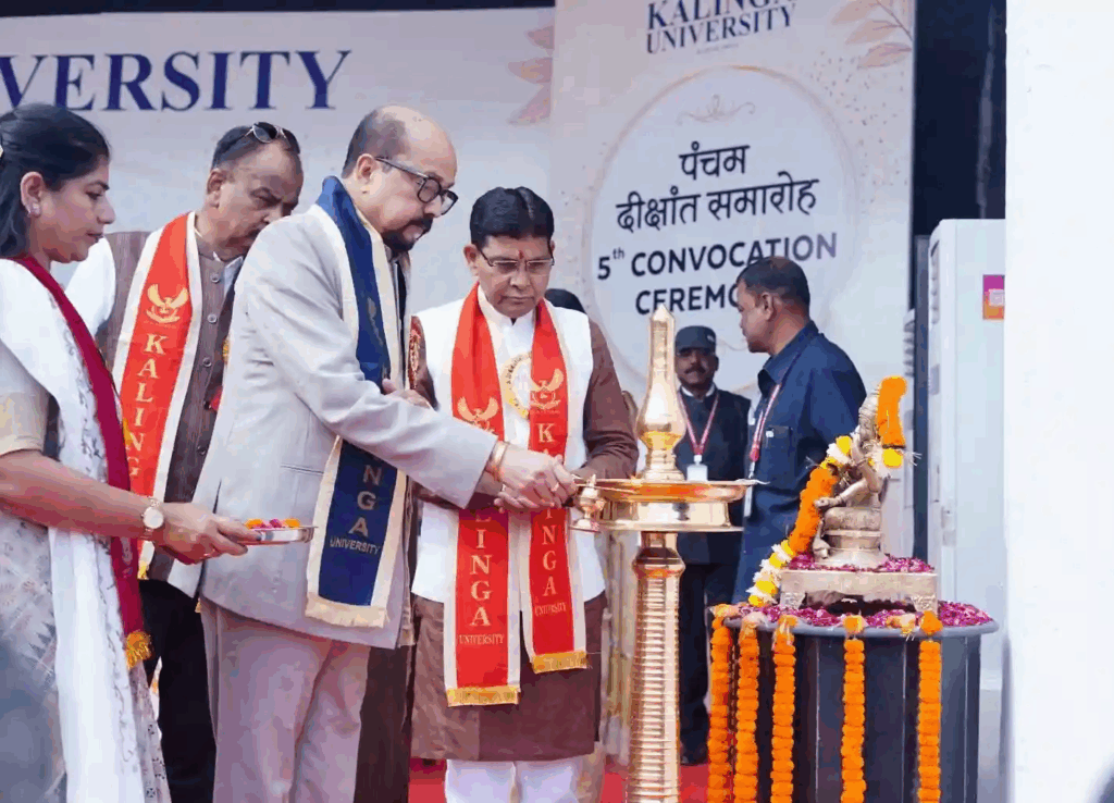 नया रायपुर: कलिंगा विश्वविद्यालय के पंचम दीक्षांत समारोह का आयोजन 12 नवंबर 2025 को संपन्न हुआ। जिसमें विश्वविद्यालय के डिप्लोमा स्नातक स्नाकोत्तर और पीएचडी के विद्यार्थियों को उपाधियां प्रदान की गई । दीक्षांत समारोह की अध्यक्षता कलिंगा विश्वविद्यालय के कुलाध्यक्ष एवं छत्तीसगढ़ के माननीय राज्यपाल श्री रमेन डेका ने किया। विशेष अतिथि के रूप में छत्तीसगढ़ शासन के राजस्व एवं आपदा प्रबंधन, पुनर्वास एवं उच्च शिक्षा मंत्री श्री टंकराम वर्मा और छत्तीसगढ़ निजी विश्वविद्यालय विनियामक आयोग के अध्यक्ष प्रोफेसर विजय कुमार गोयल उपस्थित थे ।