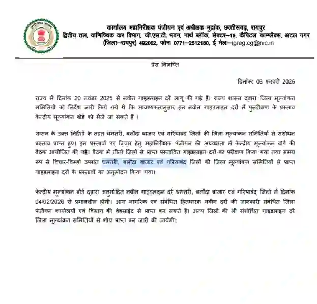 छत्तीसगढ़ के पंजीयन विभाग ने जमीन की खरीद-बिक्री को लेकर बड़ा फैसला लिया है। धमतरी, बलौदाबाजार और गरियाबंद जिलों में जमीन की नई गाइडलाइन दरें आज यानी 4 फरवरी से प्रभावी हो गई हैं। इसका सीधा मतलब है कि अब इन इलाकों में जमीन की रजिस्ट्री नए रेट के आधार पर की जाएगी। इससे पहले विभाग ने दो अन्य जिलों में भी दरों में बदलाव किया था जिसके बाद अब राज्य के कुल पांच जिलों में संशोधित दरें लागू हो चुकी हैं।