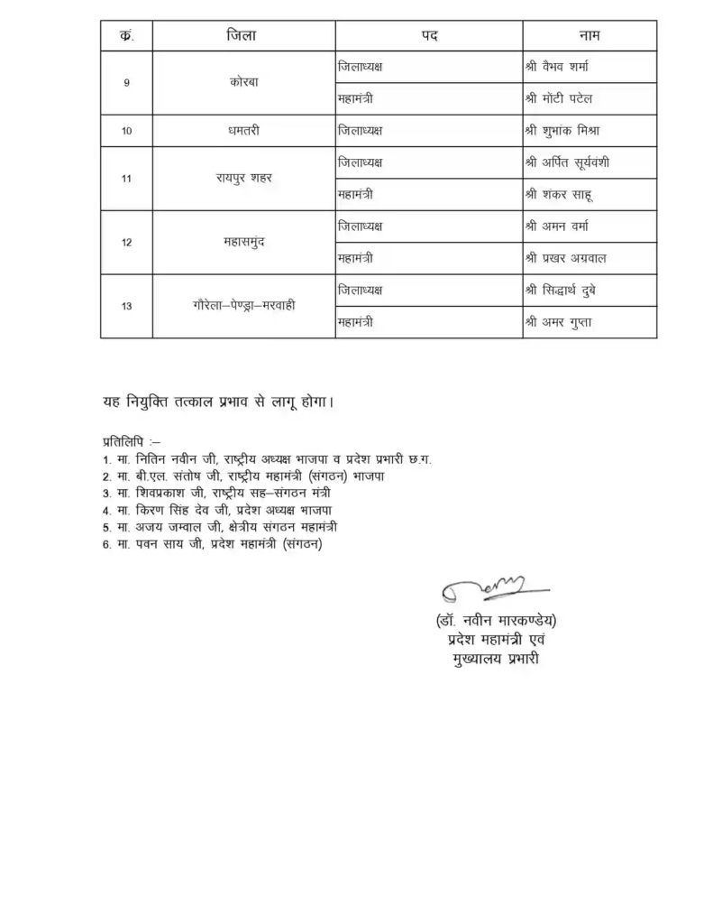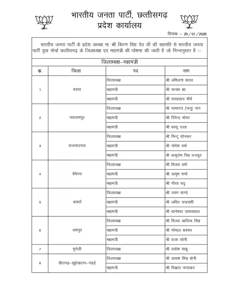 छत्तीसगढ़ भाजपा में नई नियुक्तियों की झड़ी: भाजयुमो और अन्य मोर्चा अध्यक्षों की लिस्ट जारी, 13 जिलों में युवा चेहरों को मिली कमान