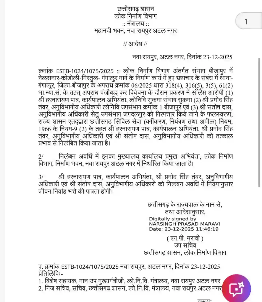 बीजापुर जिले में हुए बहुचर्चित सड़क निर्माण घोटाले में छत्तीसगढ़ सरकार ने कड़ा रुख अपनाते हुए लोक निर्माण विभाग (PWD) के तीन वरिष्ठ अधिकारियों को सस्पेंड कर दिया है। उपमुख्यमंत्री अरुण साव के निर्देश पर जारी इस आदेश के तहत कार्यपालन अभियंता (EE) हरनारायण पात्र और दो अनुविभागीय अधिकारी (SDO) प्रमोद सिंह तंवर व संतोष दास को तत्काल प्रभाव से निलंबित किया गया है। इन अधिकारियों पर कर्तव्यों में लापरवाही और गंभीर वित्तीय अनियमितताओं के आरोप हैं। निलंबन की अवधि के दौरान इनका मुख्यालय नवा रायपुर स्थित ‘निर्माण भवन’ तय किया गया है। शासन की इस कार्रवाई को भ्रष्टाचार के खिलाफ ‘जीरो टॉलरेंस’ की नीति के तौर पर देखा जा रहा है।