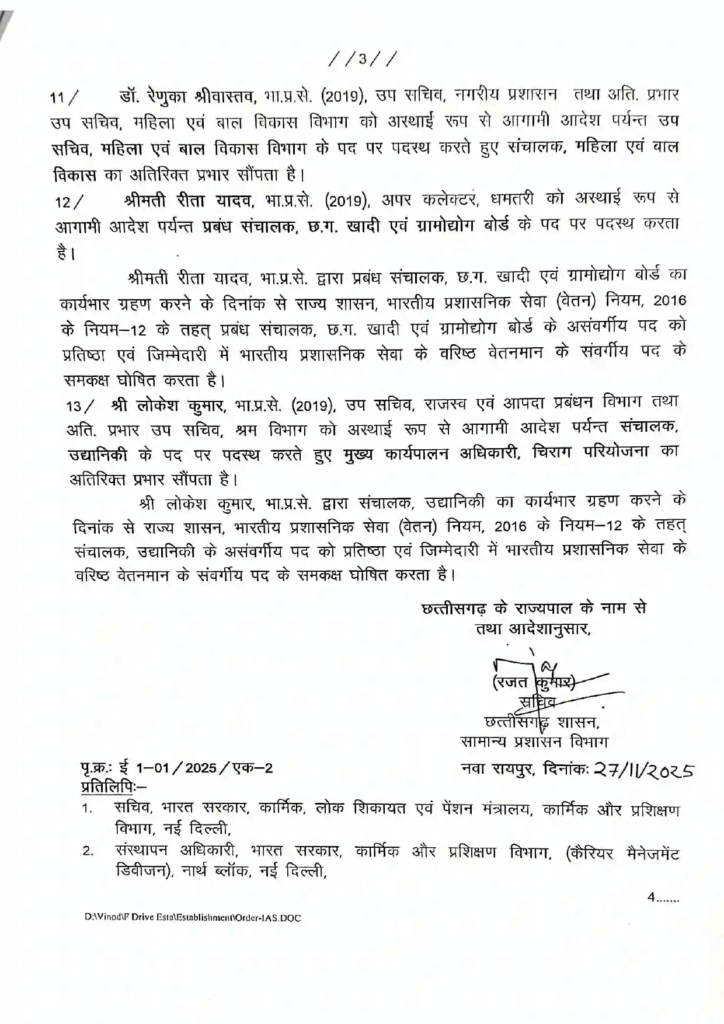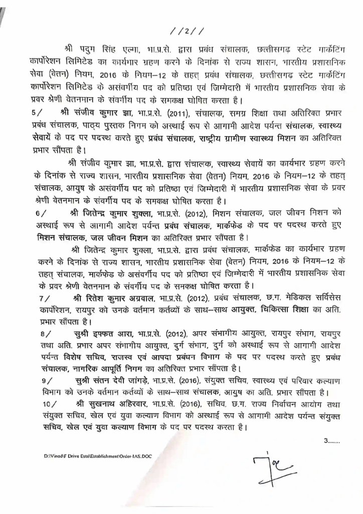 IAS जितेन्द्र कुमार शुक्ला (2012 बैच) को मार्कफेड के नए प्रबंध संचालक की जिम्मेदारी दी गई है, साथ ही उनके पास मिशन संचालक, जल जीवन मिशन का अतिरिक्त प्रभार भी रहेगा। IAS रितेश अग्रवाल (2012 बैच) को आयुक्त, चिकित्सा शिक्षा का अतिरिक्त प्रभार सौंपा गया है। IAS इफ्फत आरा (2012 बैच) को विशेष सचिव, राजस्व एवं आपदा प्रबंधन विभाग पद पर पदस्थ करते हुए MD, नागरिक आपूर्ति निगम का अतिरिक्त प्रभार सौंपा गया है।