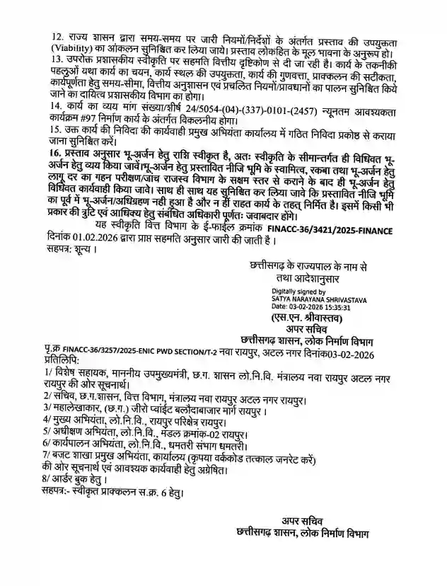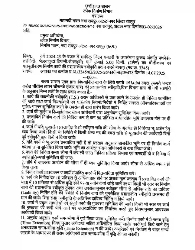 इस निर्माण कार्य के लिए कुल 15 करोड़ 34 लाख 94 हजार रुपये की राशि स्वीकृत की गई है। इस बजट से पचपेड़ी, तर्रागोदी, भेलवाकुदा, टिपानी और सेमरा (बी) मार्ग के 5 किलोमीटर हिस्से को टू-लेन बनाया जाएगा। सड़क को न केवल चौड़ा किया जाएगा बल्कि इसकी गुणवत्ता को भी बेहतर बनाया जाएगा ताकि भारी वाहनों के दबाव को यह आसानी से झेल सके। विधायक अजय चंद्राकर के लगातार प्रयासों के बाद इस बड़ी धनराशि को शासन से मंजूरी मिली है।