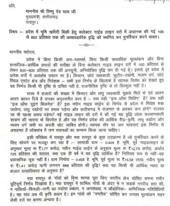 सांसद ने मुख्यमंत्री से अपील की है कि वे इस जनविरोधी निर्णय पर तत्काल पुनर्विचार करें। उन्होंने कहा कि जनता को राहत देने और आर्थिक गतिविधियों को बाधित होने से बचाने के लिए इन नई कलेक्टर गाइडलाइन दरों को तत्काल प्रभाव से स्थगित करने का निर्णय लिया जाए। यह कदम जनभावना के अनुरूप होगा और राज्य की अर्थव्यवस्था में संतुलन बनाए रखने में मदद करेगा।