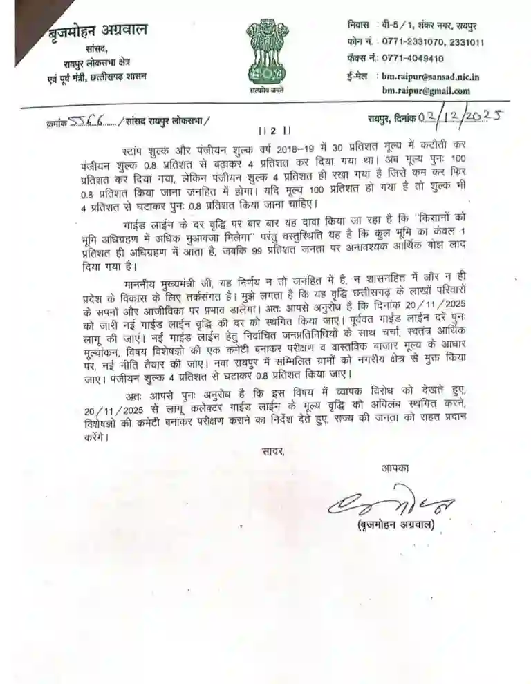 New Land Guidelines: छत्तीसगढ़ में भूमि खरीदी-बिक्री के लिए हाल ही में कलेक्टर गाइडलाइन दरों में की गई 100 से 800 प्रतिशत तक की भारी वृद्धि का व्यापक विरोध शुरू हो गया है। इसी क्रम में रायपुर सांसद बृजमोहन अग्रवाल ने इस वृद्धि पर कड़ी आपत्ति जताते हुए मुख्यमंत्री विष्णुदेव साय को पत्र लिखा है और इन नई दरों को तत्काल स्थगित करने की मांग की है। उन्होंने सरकार से आग्रह किया है कि इन दरों पर पुनर्विचार किया जाए ताकि जनता को राहत मिल सके।