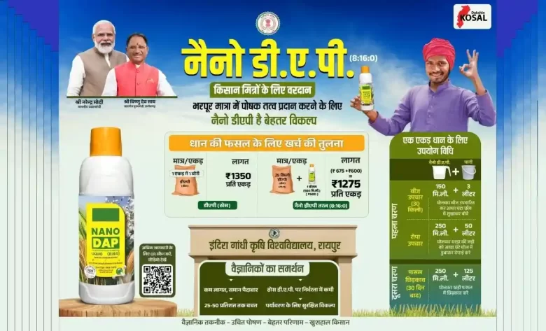 नैनो डीएपी एक आधुनिक, किफायती और प्रभावशाली तरल उर्वरक है, जो पारंपरिक डीएपी की तुलना में कहीं अधिक उपयोगी और पोषक तत्वों से भरपूर है। इंदिरा गांधी कृषि विश्वविद्यालय, रायपुर के वैज्ञानिकों ने नैनो डीएपी का समर्थन करते हुए कहा है कि इसके उपयोग से खेती की लागत में कमी आती है। नैनो डीएपी खेत में पोषण की कमी को प्रभावी ढंग से पूरा करता है और उत्पादन की गुणवत्ता को भी बढ़ाता है। नैनो डीएपी पर्यावरण के लिए भी सुरक्षित है। एक एकड़ धान की फसल के लिए एक बोरी ठोस डीएपी का उपयोग होता है। जिसकी लागत 1350 रूपए होती हैै, जबकि एक एकड़ में 25 किलो ठोस डीएपी और 500 मिली नैनो डीएपी के मिश्रण का उपयोग किया जाए तो इसकी लागत घटकर 1275 रूपए आती है।