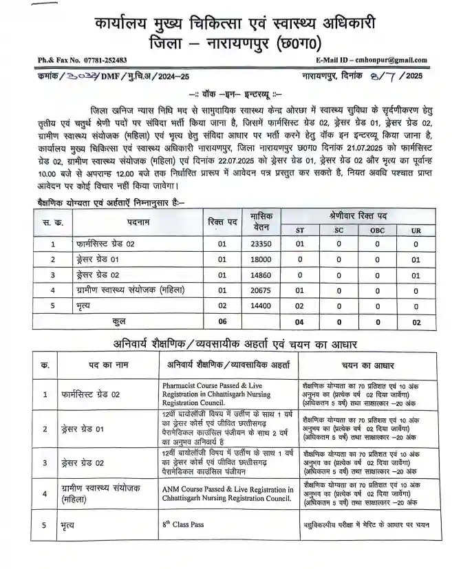 नारायणपुर: Narayanpur Health Department Bharti 2025: छत्तीसगढ़ के नारायणपुर जिले में स्वास्थ्य विभाग के अंतर्गत खनिज न्यास निधि (DMF) से सामुदायिक स्वास्थ्य केंद्र ओरछा में 06 संविदा पदों पर भर्ती के लिए वॉक-इन-इंटरव्यू आयोजित किया जा रहा है। यह भर्ती तृतीय और चतुर्थ श्रेणी के विभिन्न पदों के लिए होगी।