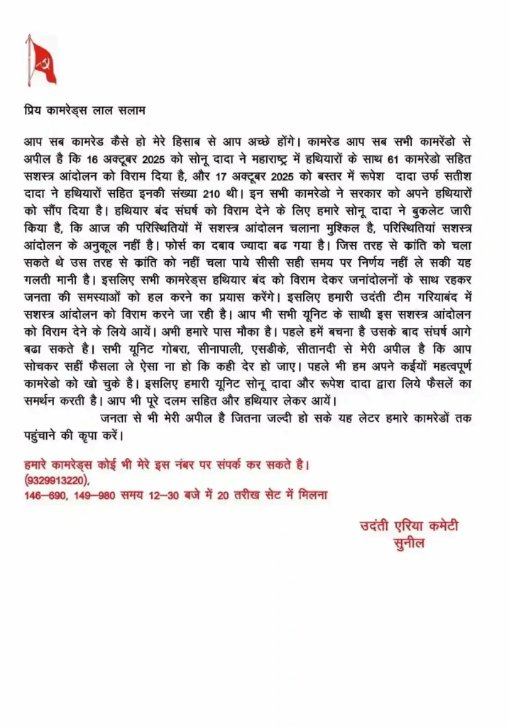 नक्सल नेता सुनील द्वारा जारी पत्र में महाराष्ट्र और बस्तर में हुए हालिया बड़े आत्मसमर्पणों का हवाला दिया गया है। पत्र में लिखा गया है कि 16 अक्टूबर 2025 को सोनू दादा ने महाराष्ट्र में 61 कामरेडों के साथ, और 17 अक्टूबर 2025 को बस्तर में रूपेश दादा उर्फ सतीश दादा ने 210 कामरेडों के साथ हथियार सौंपकर सशस्त्र आंदोलन को विराम दे दिया है।