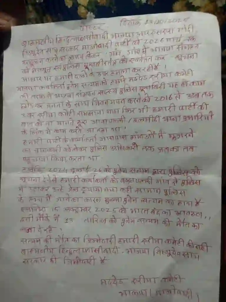 बीजापुर जिले के उसूर थाना क्षेत्र में नक्सलियों ने एक भाजपा कार्यकर्ता पूनेम सत्यम की बेरहमी से हत्या कर दी। बताया गया कि हथियारबंद नक्सलियों ने उसे घर से उठाकर जंगल में ले जाकर मार डाला। वारदात के बाद माओवादी पर्चे भी फेंके गए, जिनमें उन्होंने मृतक पर पुलिस को सूचना देने का आरोप लगाया।