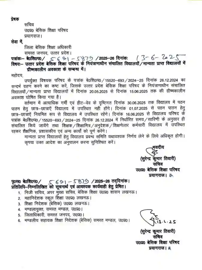 UP School Holiday: इस संबंध में बेसिक शिक्षा परिषद के सचिव सुरेन्द्र कुमार तिवारी ने सभी जिला शिक्षा अधिकारियों को निर्देश जारी कर दिए हैं। परिषद के मुताबिक, 20 मई से 15 जून तक निर्धारित ग्रीष्मकालीन अवकाश को बढ़ाकर अब 30 जून कर दिया गया है। इस दौरान छात्र-छात्राएं विद्यालय में उपस्थित नहीं होंगे, लेकिन विद्यालयों में शिक्षक, शिक्षामित्र, अनुदेशक और शिक्षणेत्तर कर्मचारी 16 जून से अपनी ड्यूटी पर उपस्थित रहेंगे। वे स्कूल में रहकर शैक्षणिक, प्रशासनिक और अन्य तैयारियों को पूरा करेंगे।