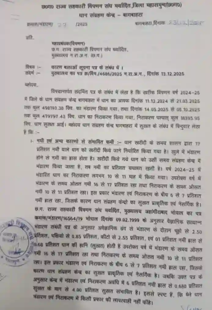 खाद्य नागरिक आपूर्ति विभाग के सचिव ने 12 सितंबर 2025 को कड़े निर्देश जारी किए थे। आदेश के अनुसार, अगर धान के स्टॉक में 1 से 2 प्रतिशत की कमी आती है, तो विभागीय जांच होनी चाहिए। वहीं, 2 प्रतिशत से ज्यादा की कमी होने पर संबंधित प्रभारी को तत्काल सस्पेंड कर उसके खिलाफ एफआईआर (FIR) दर्ज कराने के निर्देश दिए गए थे। बागबाहरा केंद्र में धान की कमी का आंकड़ा 3.65 प्रतिशत तक पहुंच चुका है, जो कि तय सीमा से कहीं ज्यादा है। इसके बावजूद अब तक न तो किसी की गिरफ्तारी हुई है और न ही किसी को निलंबित किया गया। विभाग केवल ‘कारण बताओ नोटिस’ जारी कर औपचारिकता पूरी करने में जुटा है।