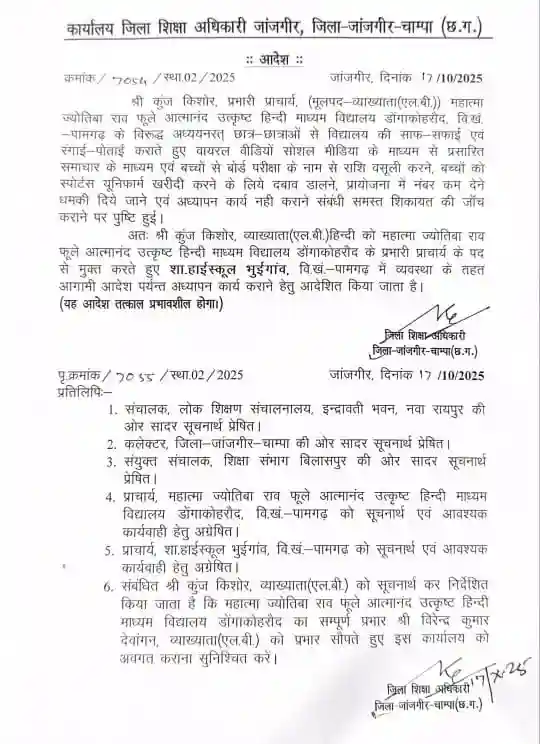 जांजगीर-चांपा: जांजगीर-चांपा जिले में शिक्षा विभाग ने एक गंभीर मामले पर सख्त कार्रवाई की है। डोंगाकोहरौद स्थित ज्योतिबा राव फुले आत्मानंद हिंदी माध्यम स्कूल के प्रभारी प्राचार्य कुंज किशोर को तत्काल प्रभाव से निलंबित कर दिया गया है। उन पर छात्राओं से कक्षा की पुताई कराने और यूनिफॉर्म के नाम पर अवैध वसूली करने का आरोप जाँच में सही साबित हुआ है। निलंबन के बाद उन्हें शासकीय हाई स्कूल भुईगांव में व्याख्याता (Lecturer) के पद पर पदस्थ किया गया है, और आगे की विभागीय कार्रवाई के लिए मामला डीपीआई (DPI) को भेजा गया है।