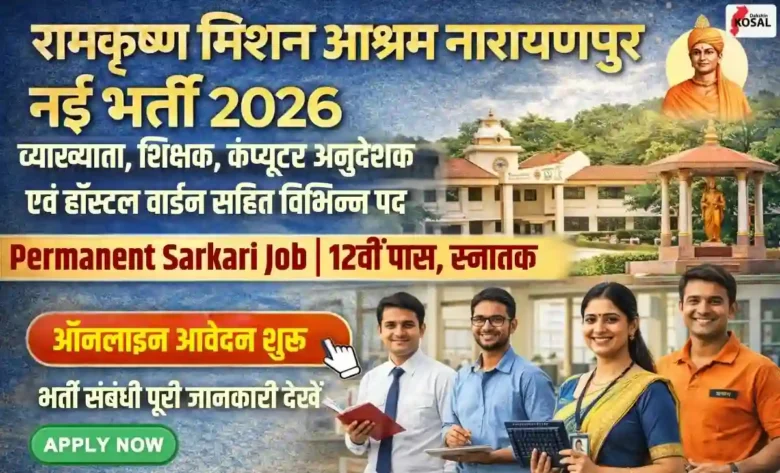 Ramakrishna Mission Ashrama Narainpur Recruitment 2026: छत्तीसगढ़ के नारायणपुर स्थित प्रतिष्ठित शैक्षणिक संस्था रामकृष्ण मिशन आश्रम द्वारा वर्ष 2026 के लिए विभिन्न शैक्षणिक एवं गैर-शैक्षणिक पदों पर भर्ती की आधिकारिक अधिसूचना जारी कर दी गई है। इस भर्ती के अंतर्गत व्याख्याता, शिक्षक, कंप्यूटर अनुदेशक, छात्रावास अधीक्षक, संगीत शिक्षक, पी.टी.आई./कोच सहित कई पद शामिल हैं। इच्छुक एवं योग्य अभ्यर्थी ऑनलाइन माध्यम से आवेदन कर सकते हैं।