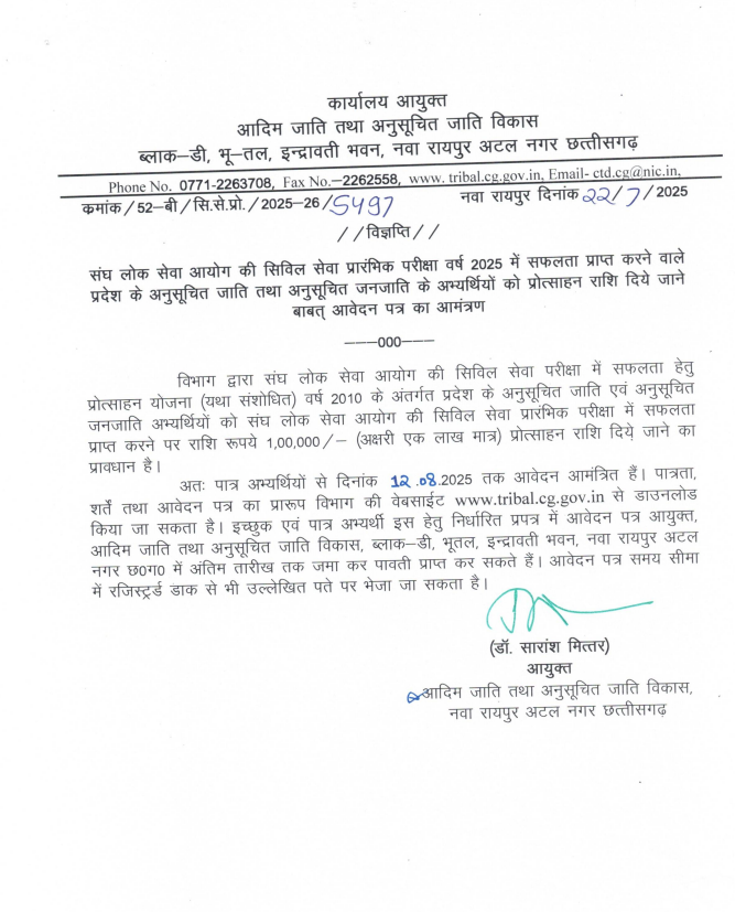 UPSC SC ST 2025: आदिवासी विकास विभाग के सहायक आयुक्त के अनुसार, इस योजना का लाभ केवल उन्हीं अभ्यर्थियों को मिलेगा जो वर्ष 2025 की UPSC प्रारंभिक परीक्षा में सफल रहे हैं और छत्तीसगढ़ राज्य के SC/ST वर्ग से आते हैं।