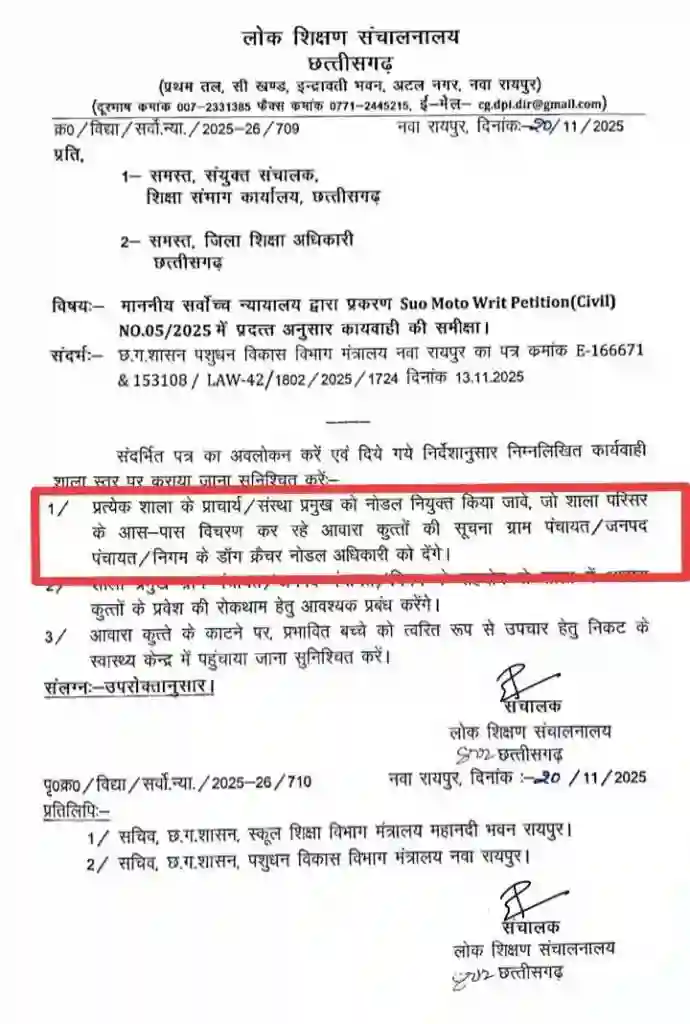 छत्तीसगढ़ लोक शिक्षण संचालनालय ने प्रदेश के सभी जिलों में स्कूलों के आसपास घूम रहे आवारा कुत्तों की निगरानी के लिए नया निर्देश जारी किया है। आदेश के अनुसार अब स्कूलों के संस्था प्रमुखों को इस काम का नोडल अधिकारी बनाया गया है। प्रत्येक स्कूल को अपने परिसर और आसपास के क्षेत्र में मौजूद आवारा कुत्तों की जानकारी दर्ज करनी होगी।