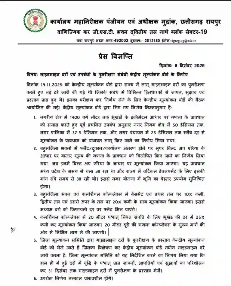 मुख्यमंत्री साय ने स्पष्ट किया था कि वर्ष 2017 के बाद गाइडलाइन दरों में कोई संशोधन नहीं हुआ था, जबकि नियमानुसार हर साल समीक्षा आवश्यक है। हालांकि, उन्होंने यह आश्वासन भी दिया था कि यदि नई दरों से जनता पर अतिरिक्त बोझ बढ़ता है, तो सरकार आम जनता को राहत देने के लिए इनकी समीक्षा करेगी। इसी कड़ी में सरकार ने आम जनता से 31 दिसंबर 2025 तक सुझाव अथवा शिकायतें जमा कराने के लिए कहा है।