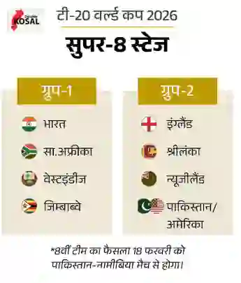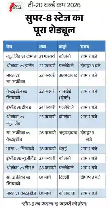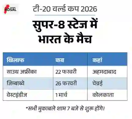 सुपर-8 स्टेज में भारतीय टीम अपना पहला मैच 22 फरवरी को खेलेगी। अहमदाबाद के मैदान पर होने वाले इस मुकाबले में भारत के सामने दक्षिण अफ्रीका की चुनौती होगी। इसके बाद टीम इंडिया 26 फरवरी को चेन्नई में जिम्बाब्वे के खिलाफ मैदान पर उतरेगी। भारतीय टीम का सुपर-8 में आखिरी मुकाबला 1 मार्च को कोलकाता में वेस्टइंडीज के साथ खेला जाएगा।