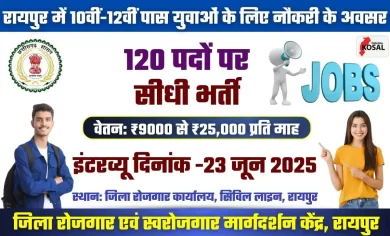 Raipur Job Fair 2025: रायपुर में 120 पदों पर होगी भर्ती, 25,000 रुपये तक मिलेगा वेतन, नौकरी पाने का सुनहरा मौका 23 जून को बेरोजगारों के लिए लगेगा रोजगार मेला