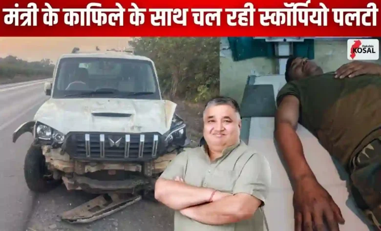 महासमुंद। छत्तीसगढ़ के महासमुंद जिले में सोमवार दोपहर एक भीषण सड़क हादसा हो गया। प्रदेश के पर्यटन एवं संस्कृति मंत्री राजेश अग्रवाल के काफिले को फॉलो कर रही एक तेज रफ्तार स्कॉर्पियो नेशनल हाईवे-53 पर पिरदा के पास अनियंत्रित होकर पलट गई। मंत्री राजेश अग्रवाल ऐतिहासिक नगरी सिरपुर में 1 जनवरी को होने वाले वीवीआईपी दौरे की तैयारियों का जायजा लेकर वापस लौट रहे थे। दोपहर करीब 2:37 बजे हुए इस हादसे में गाड़ी कई बार पलटी, जिससे उसमें सवार सुरक्षाकर्मी गंभीर रूप से घायल हो गए। घटना की सूचना मिलते ही स्थानीय पुलिस और प्रशासनिक अधिकारी मौके पर पहुंचे और राहत कार्य शुरू किया।
