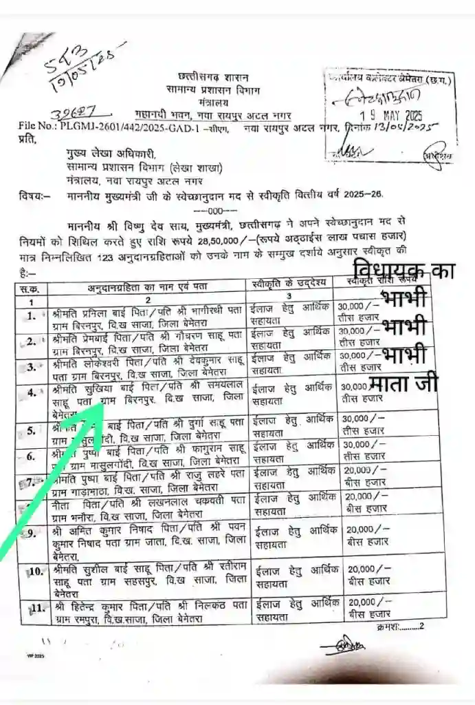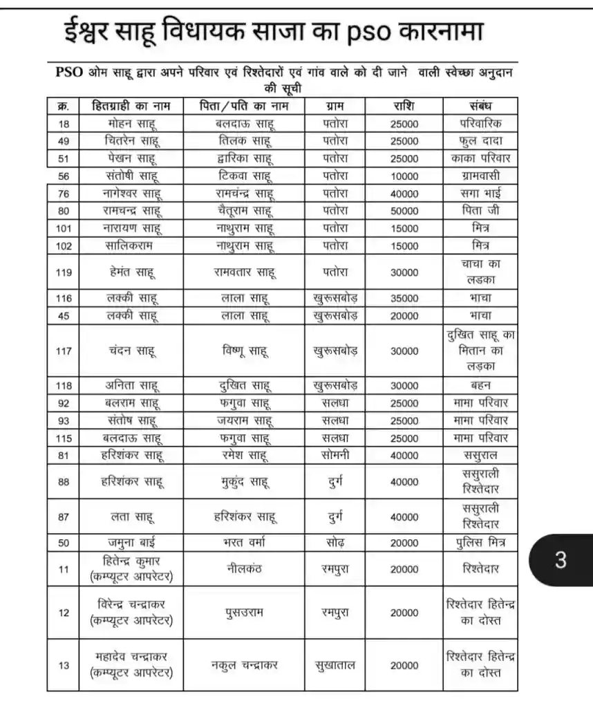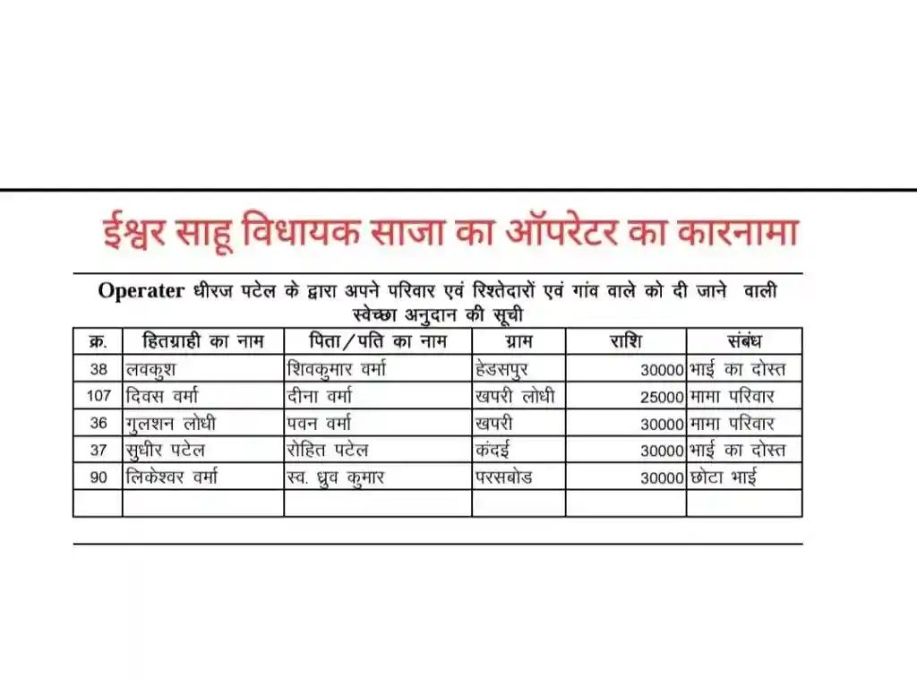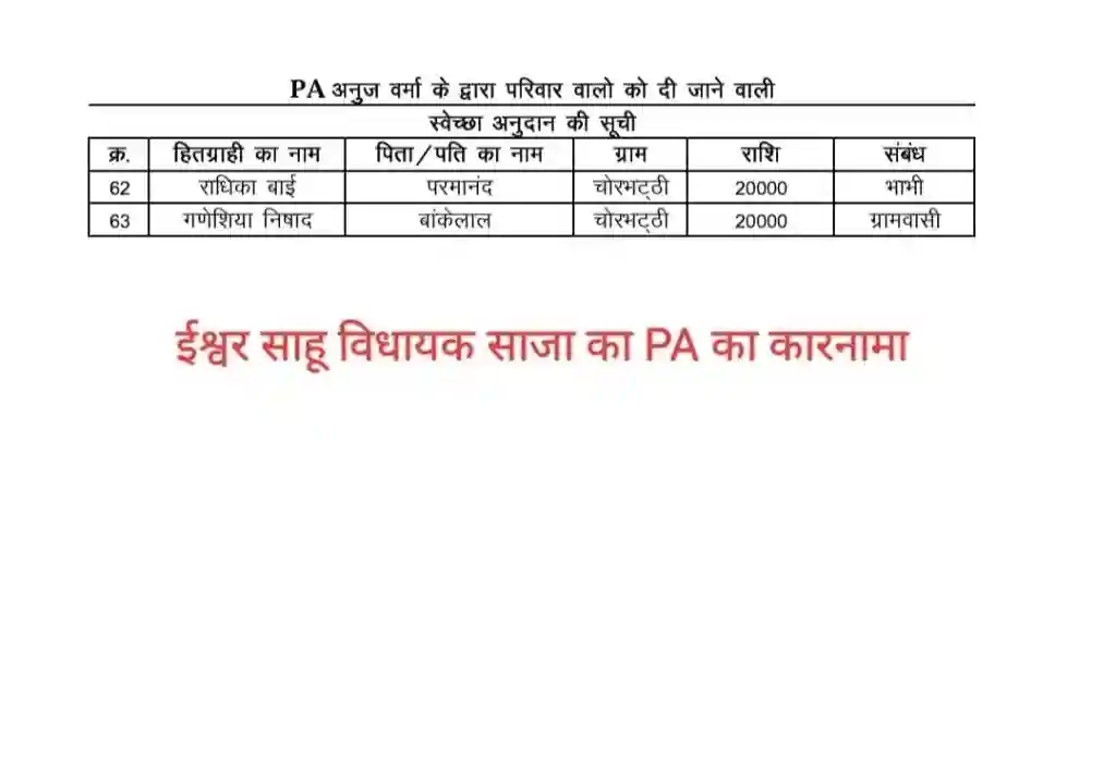 भाजपा विधायक ईश्वर साहू के दफ्तर में ‘स्वेच्छानुदान वितरण’ का बंटाधार? वायरल सूची ने खोली पोल!