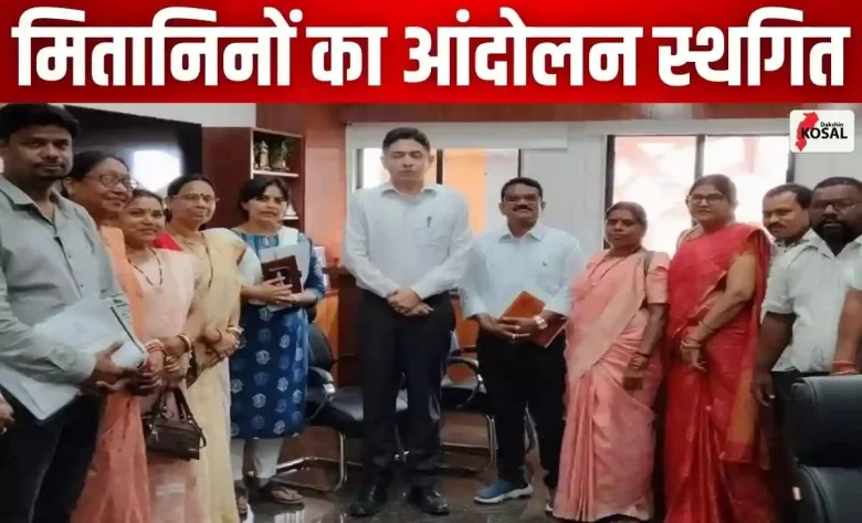 रायपुर: CG Mitanin Protest: छत्तीसगढ़ में मानदेय वृद्धि की मांग को लेकर चल रही मितानिनों की हड़ताल को फिलहाल स्थगित कर दिया गया है। मंगलवार को प्रदेश स्वास्थ्य मितानिन संघ और प्रशिक्षक कल्याण संघ के प्रतिनिधिमंडल ने स्वास्थ्य सचिव अमित कटारिया से मुलाकात की। इस दौरान सचिव ने भरोसा दिलाया कि मितानिनों की राशि में 50 प्रतिशत वृद्धि का प्रस्ताव राज्य शासन को भेजा गया है।