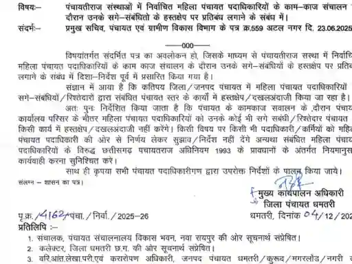धमतरी: छत्तीसगढ़ के धमतरी जिले के प्रशासन ने पंचायत व्यवस्था में एक बड़ा और ऐतिहासिक फैसला लिया है। अब महिला पंच, सरपंच, जनपद और जिला पंचायत सदस्यों के काम में उनके परिजनों की दखलअंदाजी पर पूरी तरह पाबंदी लगा दी गई है। लंबे समय से प्रशासन को यह शिकायत मिल रही थी कि पद महिलाओं के नाम पर होते हुए भी असल काम उनके पति, भाई या अन्य परिजन कर रहे हैं। प्रशासन ने इसे गंभीर माना और कड़ा आदेश जारी कर दिया है।