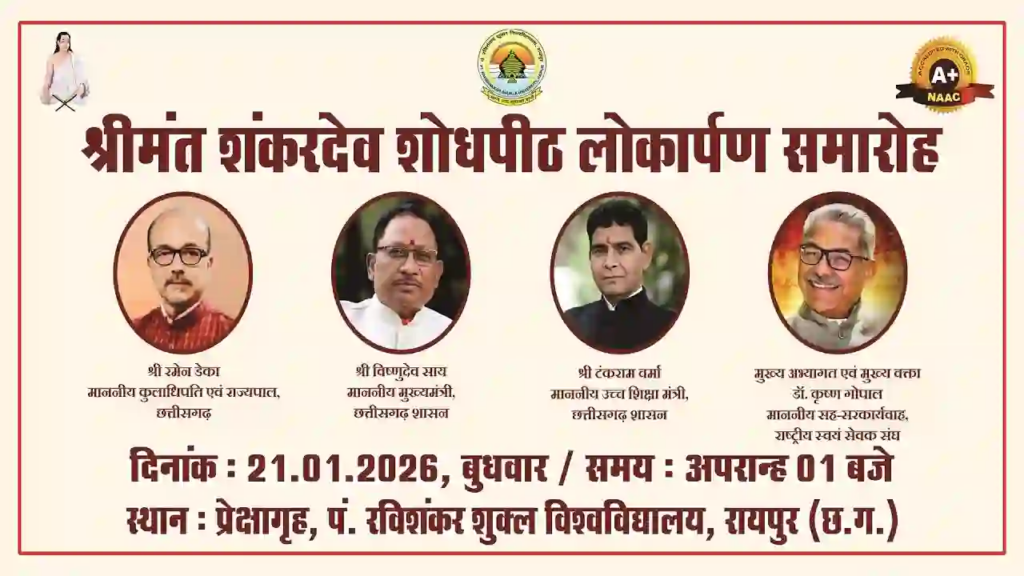 रायपुर के पंडित रविशंकर शुक्ल विश्वविद्यालय में आज ‘श्रीमंत शंकरदेव शोधपीठ’ का लोकार्पण होने जा रहा है। इस समारोह की अध्यक्षता राज्यपाल और कुलाधिपति रमेन डेका करेंगे। कार्यक्रम में मुख्यमंत्री विष्णुदेव साय और उच्च शिक्षा मंत्री टेकराम वर्मा भी बतौर अतिथि शामिल होंगे। इस शोधपीठ का उद्देश्य महान संत और समाज सुधारक श्रीमंत शंकरदेव के विचारों और उनके योगदान पर अनुसंधान को बढ़ावा देना है। विश्वविद्यालय प्रशासन ने इसे अकादमिक प्रगति की दिशा में एक बड़ा कदम बताया है।