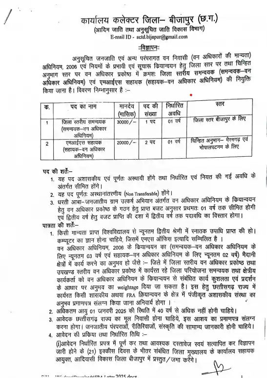 Tribal Department Bijapur Vacancy 2025 मुख्य जानकारी