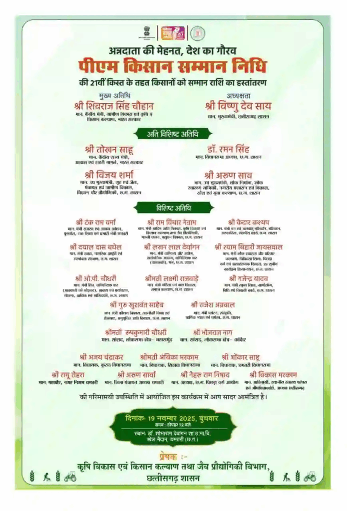 केंद्रीय कृषि मंत्री शिवराज सिंह चौहान का 19 नवंबर को धमतरी आना प्रस्तावित है। प्रधानमंत्री नरेंद्र मोदी इसी दिन किसानों के लिए किसान सम्मान निधि की 21वीं किस्त जारी करेंगे, जिसके लिए देशभर में बड़े कार्यक्रम आयोजित किए जा रहे हैं। इसी कड़ी में केंद्रीय मंत्री शिवराज सिंह चौहान पहली बार धमतरी का दौरा करेंगे। इस कार्यक्रम में प्रधानमंत्री मोदी कोयंबटूर से 21वीं किस्त जारी करेंगे, जिसका लाइव टेलीकास्ट धमतरी के कार्यक्रम स्थल पर भी होगा।