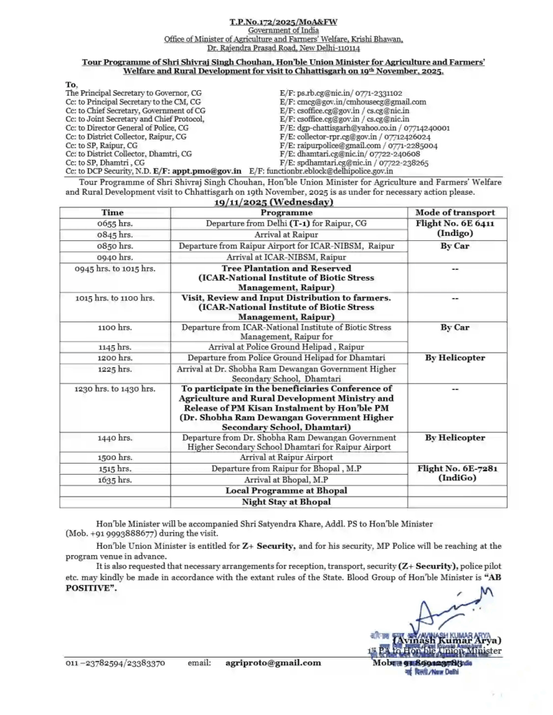 केंद्रीय कृषि मंत्री शिवराज सिंह चौहान के 19 नवंबर के धमतरी दौरे का मिनट-टू-मिनट शेड्यूल भी जारी हो गया है। कार्यक्रम के अनुसार, केंद्रीय मंत्री प्रधानमंत्री किसान सम्मान निधि की 21वीं किस्त जारी करने के कार्यक्रम में शामिल होंगे। वन मंत्री कश्यप ने कलेक्टर अबिनाश मिश्रा के साथ तैयारियों का जायजा लिया और अधिकारियों को सुरक्षित, सुचारु और व्यवस्थित तरीके से कार्यक्रम संपन्न कराने के लिए आवश्यक निर्देश दिए।