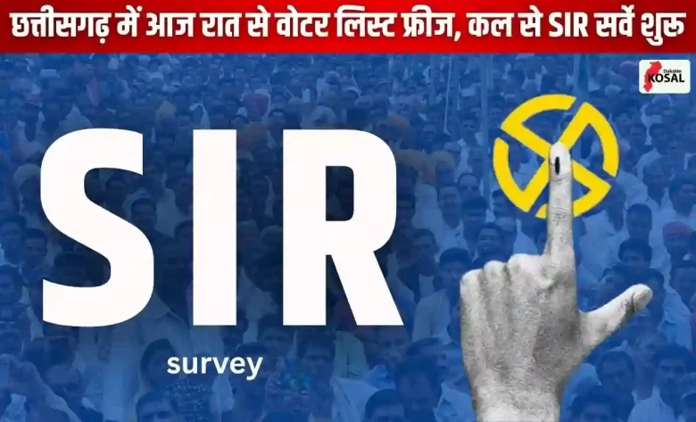 रायपुर: छत्तीसगढ़ समेत 12 राज्यों में अब बिहार की तर्ज पर विशेष गहन पुनरीक्षण (Special Intensive Revision – SIR) सर्वे किया जाएगा। मुख्य चुनाव आयुक्त ज्ञानेश कुमार ने सोमवार को प्रेस कॉन्फ्रेंस में इसकी घोषणा की। उन्होंने बताया कि आज रात (27 अक्टूबर) से ही राज्य की वोटर लिस्ट फ्रीज हो जाएगी और 28 अक्टूबर से SIR सर्वे का काम शुरू हो जाएगा। छत्तीसगढ़ में इस समय 2 करोड़ 80 लाख मतदाता हैं, जिनका अपडेशन इस प्रक्रिया के तहत किया जाएगा।