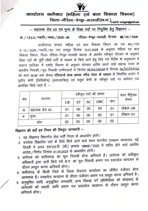 WCD GPM Assistant Grade Recruitment 2026: महिला एवं बाल विकास विभाग गौरेला पेंड्रा मरवाही में सहायक ग्रेड-03 और भृत्य पदों की सीधी भर्ती, ऐसे करें आवेदन