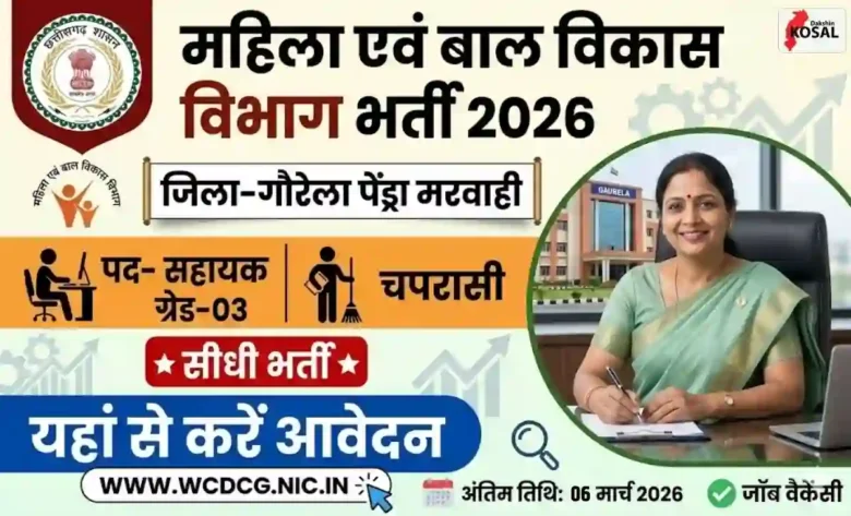 WCD GPM Recruitment 2026: छत्तीसगढ़ के गौरेला पेंड्रा मरवाही जिले में सरकारी नौकरी की तैयारी कर रहे अभ्यर्थियों के लिए अच्छी खबर है। महिला एवं बाल विकास विभाग गौरेला पेंड्रा मरवाही द्वारा सहायक ग्रेड-03 एवं भृत्य (चपरासी) पदों पर सीधी भर्ती के लिए आधिकारिक अधिसूचना जारी की गई है। इच्छुक एवं पात्र उम्मीदवार 06 मार्च 2026 तक ऑफलाइन माध्यम से आवेदन कर सकते हैं।